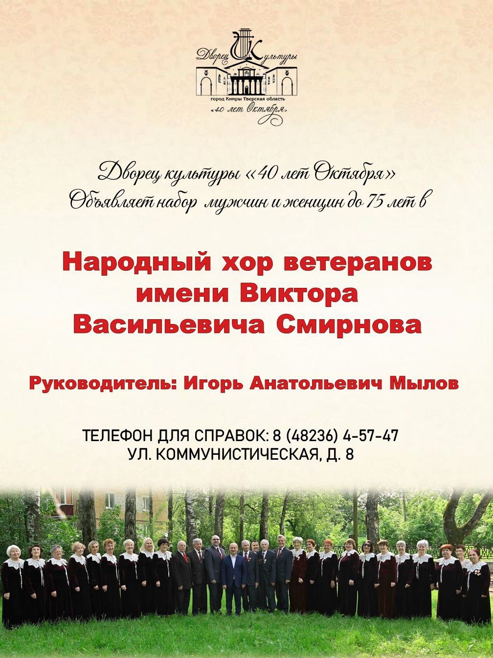 Объявляется набор в коллектив ДК «40 лет Октября» Народный хор ветеранов имени Виктора Васильевича Смирнова под руководством Игоря Анатольевича Мылова.