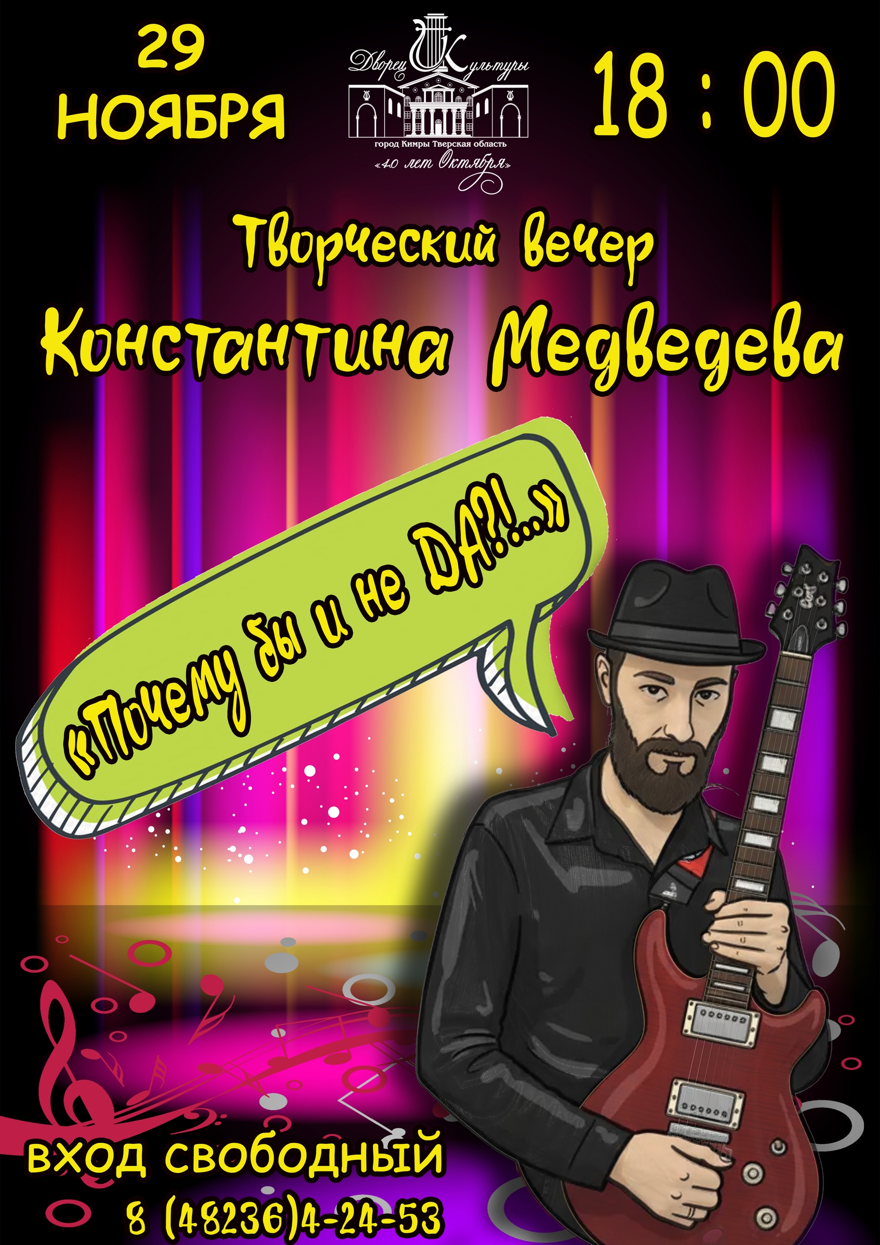 29 ноября в 18:00 на сцене Дворца культуры «40 лет Октября» состоится творческий музыкальный вечер Константина Медведева «Почему бы и не ДА?!...».