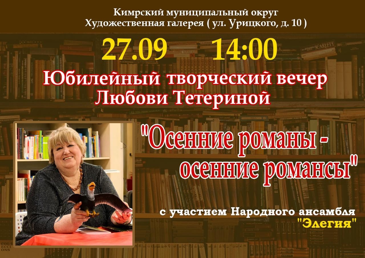 27 сентября коллектив Дворца культуры «40 лет Октября» народный вокальный ансамбль «Элегия», рук.: Марина Викторовна Шкалова, концертмейстер: Наталия Владимировна Тодоренко принял участие в Юбилейном творческом вечере Любови Тетериной «Осенние романы - осенние романсы».