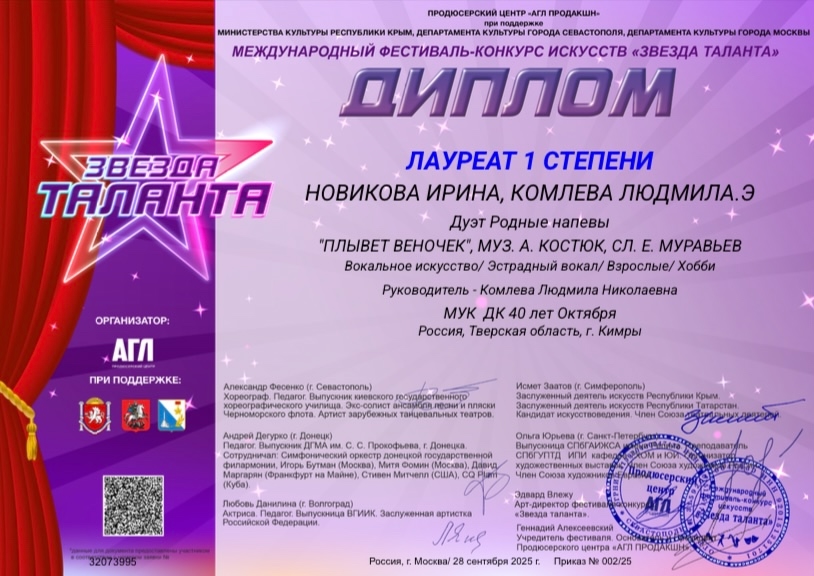 - Лауреатство II степени Дуэт Ирина Новикова, Людмила Комлева «Родные напевы», руководитель: Людмила Николаевна Комлева, с песней «Голубка белая», муз. А. Костюк, сл. Е. Муравьев.