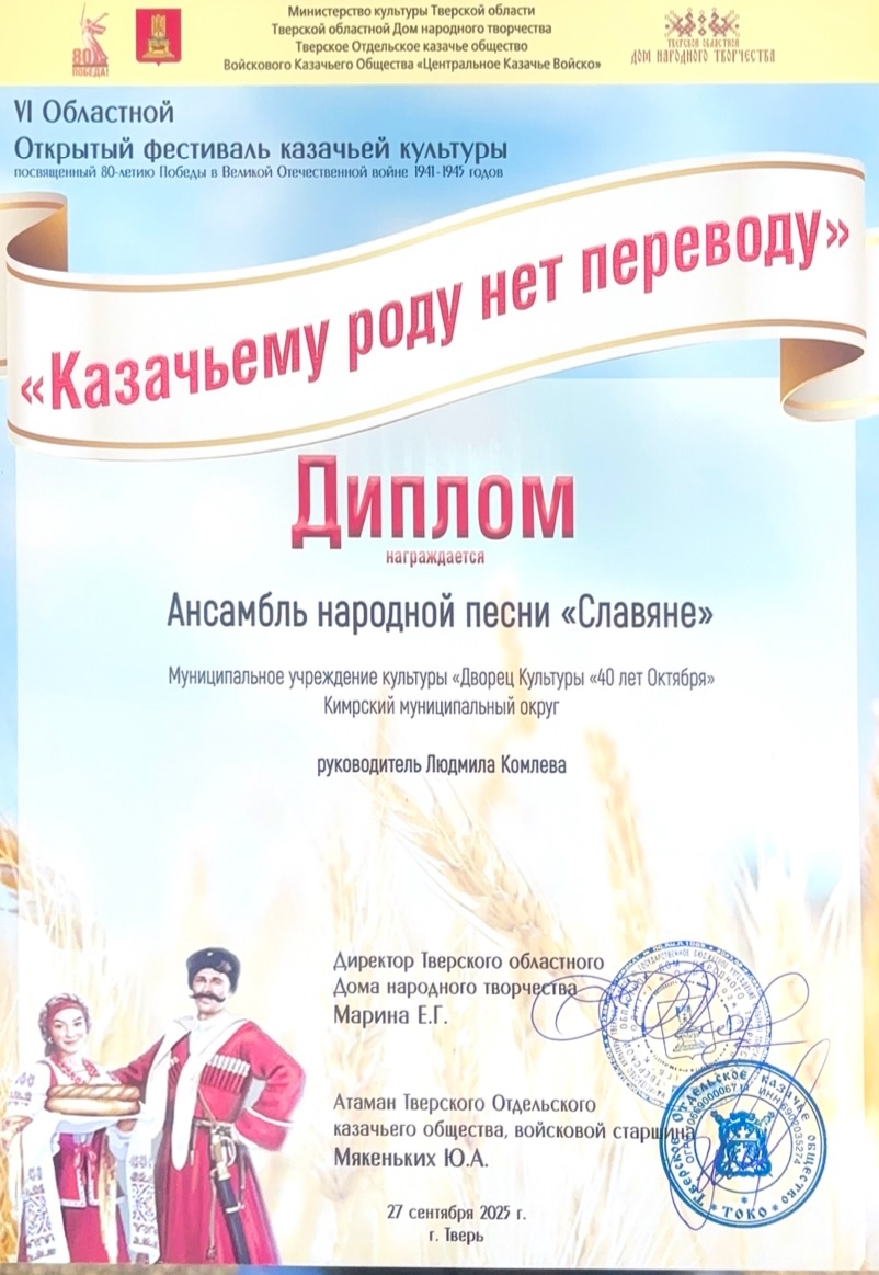 27 сентября творческий коллектив ДК «40 лет Октября» ансамбль народной песни «Славяне» под руководством Людмилы Николаевны Комлевой принял участие в VI областном открытом фестивале казачьей культуры «Казачьему роду нет переводу», посвященного 80-летию Победы в Великой Отечественной войне 1941-1945 годов, в Тверском областном Доме народного творчества.