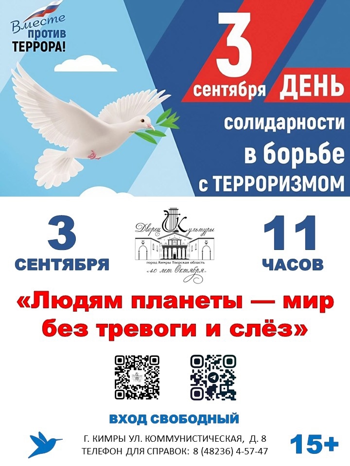 3 СЕНТЯБРЯ - ДЕНЬ СОЛИДАРНОСТИ В БОРЬБЕ С ТЕРРОРИЗМОМ 3 сентября в 11:00 в ДК «40 лет Октября» пройдет информационная программа «Людям планеты — мир без тревоги и слёз», посвященная Дню солидарности в борьбе с терроризмом. Вход свободный. Телефон для справок: 8 (48236) 4-57-47