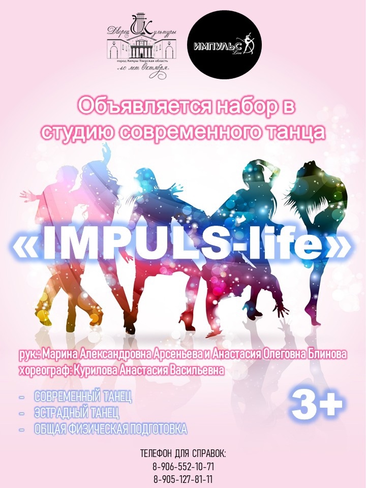 Объявляется набор в студию современного танца «IMPULS-LIFE» Дворец культуры «40 лет Октября», рук.: Марина Александровна Арсеньева и Анастасия Олеговна Блинова, хореограф: Курилова Анастасия Васильевна.